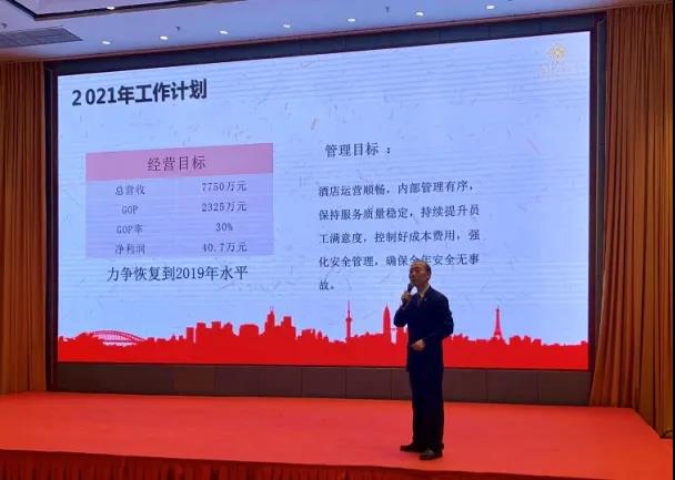 在對2020年度工作全面總結(jié)中,酒店經(jīng)營班子肯定了全體員工在過去一年的辛勤付出和取得的經(jīng)營成效,并對2021年度工作目標(biāo)進(jìn)行了部署和動(dòng)員。