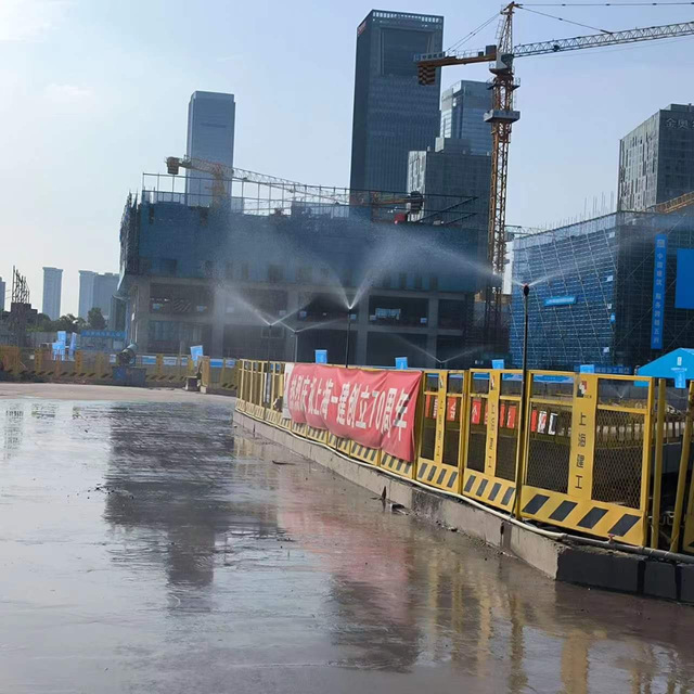 該項(xiàng)目A、B、C區(qū)目前處于底板施工階段,針對揚(yáng)塵管控,新城公司項(xiàng)目管理團(tuán)隊(duì)嚴(yán)格按照“十達(dá)標(biāo)”管理標(biāo)準(zhǔn)進(jìn)行施工,在出入口規(guī)范設(shè)置沖洗平臺,并配合高壓水槍等設(shè)備對進(jìn)出車輛進(jìn)行全方位沖洗,杜絕了車輛帶泥上路。施工現(xiàn)場配備霧炮機(jī)、高桿噴淋進(jìn)行360°旋轉(zhuǎn)降塵。同時(shí),項(xiàng)目安排專人對施工道路進(jìn)行清掃,灑水車不間斷灑水使道路保持濕潤,進(jìn)一步提升工地抑塵效果。
